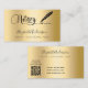 An elegant business card on a faux gold metallic looking background and a black signature signing pen. Elegant hand lettered style script. Personalize and add Your name, title, contact info and your own QR code to your website address.