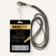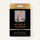 Modern Photo ID badge in black and gold with space for a custom profile photo, job title, contact details, services and barcode. This elegant employee name badge features black background and faux gold effects with fully editable text and a photo.