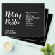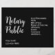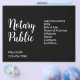 Notary Public appears in a large elegant script. Lines of text for your name and phone number are under the script. A list of services offered is next to the script. The flyer is black. The text is white. All text can be edited or deleted.