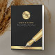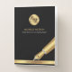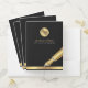 Create branded presentation folders for your business using this elegant black and gold pocket folder design - great for notary public and loan signing agents, attorney or any other professional. The front of this promotional folder features black background, your logo and name, a gold effect ink pen graphic and a gold color bar with space for your website. The back features space for your services, contact details and a custom badge/stamp.