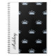 Notebook shown with a art print of a Silver Blue colored crown on a black background and a custom name. Notebook shown in a Black and White design. Customize this item and change the name to yours or take off the name and buy as is.
