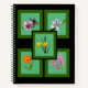 Five different flowers (plum, iris, daffodil, calendula, and lilac) are set on light background with dark green frames. An image sits in each corner with the fifth image place over them in the center. Frames are set on black background.