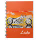 Notebook shown with a photo print of a sharp looking motorcycle and a custom name. Customize this item and change the name to yours or take off the name and buy as is. Stock Image