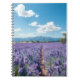 This notebook has an outdoor scene with a field filled with purple flowers and distant mountains.