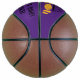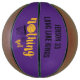 Full size personalized basketball in purple and gold. The design features the basketball quote "nothing but net", illustrated with a basketball and net. You can add your name, jersey number and team or custom text, which is printed in black uppercase typography. It has a color palette of purple, black and gold. Please browse our store for more basketball gifts.