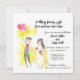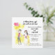 Cartoon bride and groom happily inviting you to their casual open bar wedding celebration.