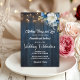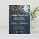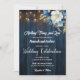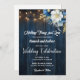 An elegant Wedding Invitation with elegant calligraphy completed by wonderful blue wood, garden string lights and white blue floral with gold glitter. You can personalize this card with your Wedding details.