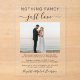 Elegant clear acrylic elopement or private wedding announcement and casual reception invitation featuring your photo and "Nothing Fancy Just Love' in a mix of simple typography and a stylish script with swashes. Under your photo, personalize your details and add your names in a signature-like script.