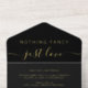 Elegant black elopement or private wedding announcement and casual reception all in one invitation featuring "Nothing Fancy Just Love" showcased in simple lettering and a chic script with swashes, your marriage announcement and reception invitation, and a tear away RSVP response postcard, all rendered in your choice of genuine gold, silver or rose gold foil.