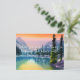 Beautiful artistic postcard features watercolor digital painting of a peaceful mountain lake with overlay of a profound and inspirational Zen quote: