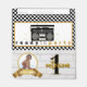 Urban Retro 90's Hip Hop Birthday Vibe! Boombox and Ready to Party Text on the front. Notorious ONE text on the back. Modern white brick background. Black, white and gold colors. Checkerboard pattern accents. Customize with your child's name! Add your own photo! ©2022 Miss Sassy Party Designs