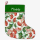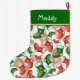 Cute pattern of tiny holiday stockings in red and green is a funny, fun and festive design on this Christmas stocking. Personalize the name for a custom made stocking. The stocking is primarily green at the top, a place for a name in a whimsical font. Thin red and white stripes separates the green top from the patterned body of the stocking. The body displays a repeating pattern of Christmas stockings in varying shades of red and green, each adorned with a white star and snowflakes. The overall color palette includes red, green, and white. The stockings in the pattern are decorated with a textured appearance to suggest stitches and embroidered designs. The style appears festive and cheerful.