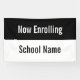This Now Enrolling banner has a black stripe at the top. White display text is on the black stripe. The bottom stripe is white and has black text for the school name. All text can be edited or deleted.