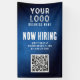 Now Hiring Banner with QR Code: Capture attention and streamline your hiring process with this eye-catching banner. Featuring the distinctive blue grunge gradient background, this banner prominently displays your company's logo alongside a QR code that links directly to your online job listings. Ideal for job fairs, corporate events, or placement outside your business premises, this banner effectively communicates your hiring needs while reinforcing your brand identity.