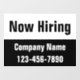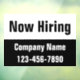 The top portion of the window cling is white. Black display text is at the top. You can edit the text to show a custom message. (Shown: Now Hiring) The bottom portion is black with white text. There are two lines of display text at the bottom. You can edit them to show a custom message such as your company name and phone number.