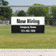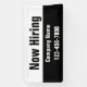The top portion of the car magnet is white. Black display text is at the top. You can edit the text to show a custom message. (Shown: Now Hiring) The bottom portion is black with white text. There are two lines of display text at the bottom. You can edit them to show a custom message such as your company name and phone number.