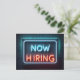 A neon sign against a dark brick wall displays the words "NOW HIRING" in bright blue and red letters for business employment.