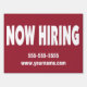 Now Hiring sign in white on red (or change the background color on both sides if you like) for an eye catching notice that your business is offering employment. Edit the information lines to add your own contact info or other text.