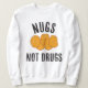 Nugs Not Drugs is a simple message that says it all. It's better to spend your money on chicken nuggets than on illicit substances. Slight grunge/"distressed" look. Great gift for friends who like to eat fast food, and for those who enjoy finishing food challenges.