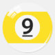 Stickers featuring a yellow and white number nine pool ball with reflection. Perfect christmas or birthday gift for pool players. All sixteen balls are available on coasters, stickers, magnets, keychains and ornaments.