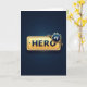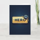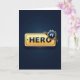 This design shows a deep, moody blue background that fades gently from darker to lighter tones, giving the scene a quiet sense of depth. Centered across the card is a shiny gold plaque with rounded corners and beveled edges, catching light like polished metal and adding a soft, affectionate glow ❤️. The word “HERO” sits in the middle of the plaque in dark blue, all-capital letters, looking engraved and slightly glossy against the gold. A small dark circular rivet-like dot appears on the left side of the plaque, adding a sturdy, grounded detail that feels like a steady hand in a close friendship. In the upper right, a spiky starburst badge in deep blue leans over the plaque like a proud companion, with “#1” set in crisp white at its center. Behind that badge, a ribbon trails outward in alternating dark blue and gold stripes, curling as if it’s wrapping the award in a gentle, celebratory embrace 🌼. Subtle reflections and highlights run along the plaque edges and ribbon folds, while the starburst points stay sharp against the smooth blue gradient backdrop. The ribbon’s striped tail angles down and back from the top-right corner, partially tucked behind the gold plaque.