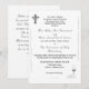 Design front features a pure white background to the elegant image of a silver crucifix at top left corner. Bottom right corner displays the image of the Holy Eucharist suspended above chalice with the image joined wedding rings displayed beside it. Following the traditional format for a Catholic wedding invitation, text is featured in an elegant black font. The names of bride and groom, along with event are displayed in a graceful Nuptial font. Design is accented by an elegant flourish aligning the left and right sides.