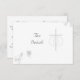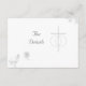 Design front features customizable heading displayed beside the image of a cross with joined wedding rings in center. Top right and bottom left corners feature the image of roseleaves. Bottom left corner also depicts the image of two doves, one in flight towards the other.