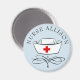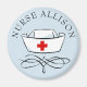 This magnet features a nurse's cap with a cross on it along with a decorative flourish below. Above is a nurse's name for you to personalize. Background is pale blue but may be customized. Perfect for a nurse or nursing school graduate.