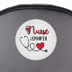 Customizable nurse patch featuring a lovely black stylized stethoscope forming a cute red heart, with the word Nurse in a red calligraphy font with a black outline on a white background. Easily customizable by adding your name in a modern all caps black font.