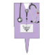 Creative nursing school graduation party cake topper featuring lavender hospital scrubs, stethoscope and Swiss Army Knife. Edit text to add nurse's name.
