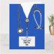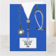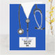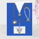 Creative medical-themed nursing school graduation cards featuring blue hospital scrubs. Edit text to add name of nurse and medical credentials.