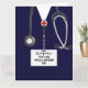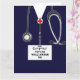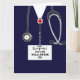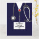 Creative medical-themed nursing school graduation cards featuring navy blue hospital scrubs. To personalize edit text to add name of nurse and medical credentials.