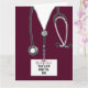 Creative medical-themed nursing school graduation cards featuring maroon hospital scrubs. To personalize edit text to add name and medical credentials.