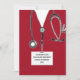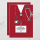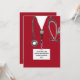 Nurse grad party invites or nursing school graduation announcement template featuring red hospital scrubs and healthcare supplies.