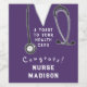 Nurse graduation gift labels and nursing school grad party decoration featuring purple hospital scrubs. Edit text to add nurse's name.