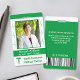 These photo ID badges have a green-and-white theme. They include your employee photo, name, and job title on the front, plus the name of the hospital / company. You can also choose to keep the caduceus or replace it with your personalized logo. The back includes room for "if found" information (including address and phone number), plus space for an ID number and a bar code. Use the easy template to personalize, and then use the design tool to make more detailed changes (such as adjusting the size of the logo or barcode or deleting and rearranging elements). This eye-catching design is perfect for a nurse, nurse practitioner, doctor, or anyone in the medical field.
