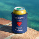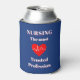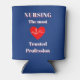 This nurse's can cooler has a navy blue background and a red heart with a normal cardiac complex on it. The text displays the highest honor that a profession can receive, an honor which Nursing has achieved for years. On the back of the can cooler you can personalize it with a name and title.