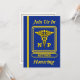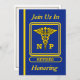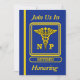 This blue and gold invitation is decorated on the front with the retired Nurse Practitioner caduceus shield. You can customize this card by placing your information into the boxes provided.