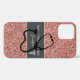 Protect your phone in style with this Nurse Practitioner Rose Gold Glitter Personalized iPhone 12 Case. It is designed with pink faux glitter background and grey horizontal stripe on the center. A black stethoscope silhouette and white caduceus symbol with "nurse practitioner" is in white minimal print lettering. Name is in stylish white hand lettered script. CLICK "PERSONALIZE TEMPLATE" OPTION AND ENTER NAME.