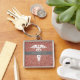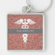Get your day started off right with this Nurse Practitioner Rose Gold Glitter Personalized keychain. It is designed with a pink faux glitter background and grey horizontal stripe on the center with your full name and occupation job title "FNP." A white caduceus symbol is on the center.