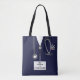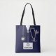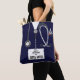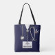 Creative nurse bag featuring navy hospital scrubs, stethoscope and funny Swiss army knife. To customize edit text to add name.