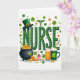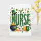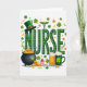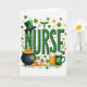 This St. Patrick's Day card features the word “NURSE” centered in large letters filled with dark green plaid on a bright white background. Above the “N,” a leprechaun-style top hat with a gold buckle tilts like a friendly wink, and a green caduceus rests on the “R,” linking care and celebration. Around the main word, small shamrocks and confetti-like dots in green and orange drift across the space, adding a light, social energy ☘️. Below the lettering, a black pot overflows with shiny gold coins, set close enough to feel like a shared lucky find between friends 💚. A small pink pill bottle sits nearby, softening the scene with a gentle nod to everyday kindness. To the right, a tall glass of golden beer with a foamy top stands beside a green mug marked with a shamrock, as if two people just set them down mid-toast. The text is dark green and placed squarely in the middle, while the hat and caduceus sit just above the top edge of the letters and the coins, bottle, and drinks line up beneath. Tiny green and orange shapes are sprinkled in the open white areas around the word and along the lower row of icons.