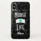 Cute design case for nurses with stethoscope silhouette patterned on background and customizable color. White nurse's cap with turquoise medical cross centered on case and "Nurse Life" in white typography.