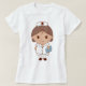 Cute cartoon nurse with brown hair and a sweet smile. She is wearing a white nurse outfit and hat and carrying a blue medical file under one arm.