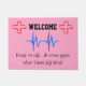 Medical series: A fun doormat for a nurse or other medical staff. In pink, it has the classic medical red cross symbol as a stylized graphic and an ecg trace of a healthy heartbeat. The fun text says "Nurse on call - do come again when I have less time".