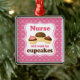 Cute holiday keepsake ornament has Nurse will work for cupcakes design on pink background.