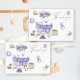 The invitation shows watercolor a baby cradle, a nursery mobile in the form of purple round clouds, children's toys: a rodent elephant, a duck on wheels, a teddy bear, a bunny, a bib, a pacifier, a pyramid.