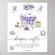 The invitation shows watercolor a baby cradle, a nursery mobile in the form of purple round clouds, children's toys: a rodent elephant, a duck on wheels, a teddy bear, a bunny, a bib, a pacifier, a pyramid.