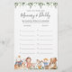 nursery rhymes themed baby shower how old were they game card features a watercolor safari animals illustration and watercolor greenery eucalyptus garland and elegant handwritten style font.