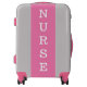 This cute Nurse's Pink and Grey Suitcase will have you loving to pack your bags and travel. This luggage has a light grey shell case and the centered stripe is pretty pink with "NURSE" in large white letter design. The handle, bumpers and wheels are pink. You can customize the color of grey background if you'd like. Also you can order in different color of handle, bumper and wheels. Great gift idea for a travel nurse too!